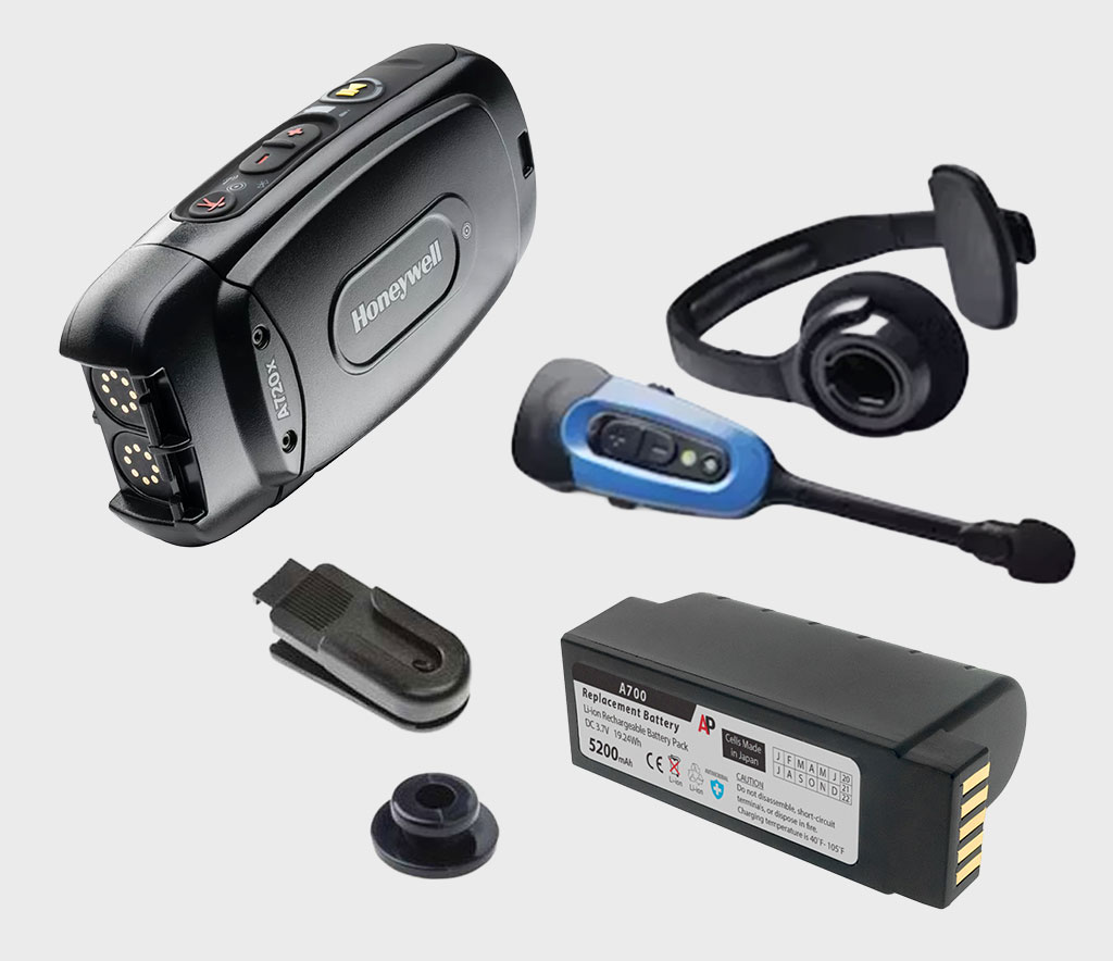Batteries, scanners, cables, and Honeywell Talkman (Vocollect) units.